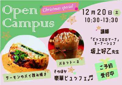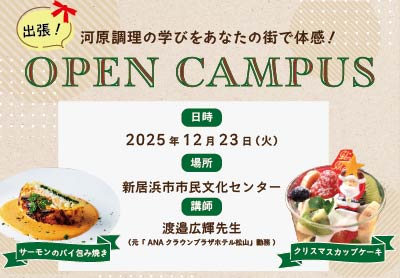 12/23(火)新居浜市市民文化センターにて出張オープンキャンパスを開催いたします! 調理、製菓どちらも体験でき、クリスマスムードが漂うメニューとなっておりま...