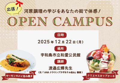 12/22(月)宇和島市和霊公民館にて出張オープンキャンパスを開催いたします! 調理、製菓どちらも体験でき、クリスマスムードが漂うメニューとなっております! ...