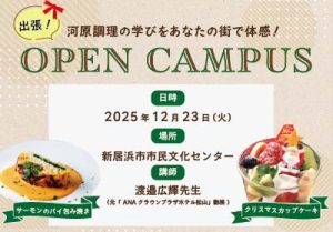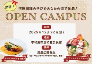 12/22(月)宇和島市和霊公民館にて出張オープンキャンパスを開催いたします! 調理、製菓どちらも体験でき、クリスマスムードが漂うメニューとなっております! お友達とご一緒にご参加ください! 「サーモンのパイ包み焼き」 サーモン...